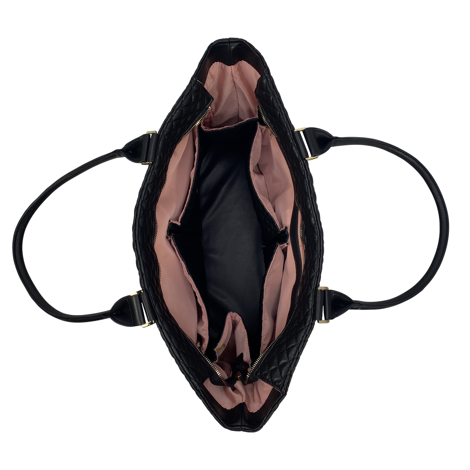 The Timeless Quilted VIP Tote combines elegance with functionality, perfect for travel with its Chanel-inspired black diamond quilting: